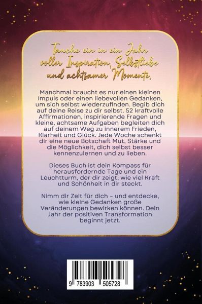 Ein Jahr in Achtsamkeit - Dein Weg zu Selbstliebe und innerem Frieden Bist du bereit, dein Leben achtsamer und liebevoller zu gestalten? Manchmal braucht es nur einen kleinen Impuls, um innezuhalten und die eigene Kraft zu spüren. Dieses Buch ist ein treuer Begleiter, der dir Woche für Woche neue Inspiration schenkt. Mit 52 kraftvollen Affirmationen, inspirierenden Fragen und kleinen, achtsamen Aufgaben unterstützt es dich dabei, in deinem hektischen Alltag Momente der Ruhe und Klarheit zu finden.Was erwartet dich in diesem Buch? wöchentliche Affirmationen, die dich stärken und ermutigen inspirierende Fragen, die dir helfen, tief in dein Inneres zu schauen praktische Aufgaben, die deine Selbstliebe und Achtsamkeit fördern 52 Affirmationskarten zum AusdruckenFür wen ist dieses Buch? Für alle, die auf der Suche nach mehr Selbstliebe, innerer Ruhe und positiver Veränderung sind. Egal, ob du am Anfang deiner Achtsamkeitsreise stehst oder bereits erfahren bist - dieses Buch gibt dir die Impulse, die du benötigst, um dein volles Potenzial zu entfalten.Ein Geschenk an dich - oder an jemanden, der dir wichtig ist.