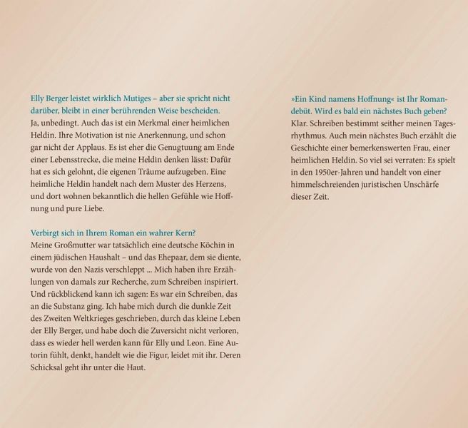 Marie Sand hat mit „Ein Kind namens Hoffnung“ ihren Debütroman vorgelegt, der den Leser in die dunkelste Zeit deutscher Geschichte zurückführt, wo er mit Elly eine der damaligen Personen kennenlernt, die sich unter großer Gefahr für andere selbstlos einsetzten. Der flüssige, farbenfrohe und gefühlvolle Erzählstil nimmt den Leser sofort mit auf eine Reise in die Vergangenheit, wo er über den Zeitraum von 1938 bis 1958 das Schicksal von Elly und Leon hautnah mitverfolgt. Elly hat schon als junge Frau ihre eigenen Ziele verfolgt, auch wenn sie dafür ihr sicheres Elternhaus verlassen musste. In einer fremden Stadt hat sie sich ihren Wunsch, Köchin zu werden, mit viel Fleiß verwirklicht und bei den Sternbergs nicht nur Arbeitgeber, sondern eine Ersatzfamilie gefunden, wo sie auch noch ihrer Kochleidenschaft frönen kann. Als die Sternbergs deportiert werden, übernimmt Elly die Verantwortung für deren Sohn Leon, was für sie beide eine ständige Gefahr und eine lange Flucht bedeutet. Über die Jahre sucht Elly nach Leons Mutter Sara, auch als sie selbst schon Mutter ist. Befremdlich ist die Tatsache, dass sie Leon sogar ihrer eigenen Tochter Matilda vorzieht. Natürlich kennt sie Leon schon lange und dessen Schicksal berührt sie umso mehr, da sie selbst in dem Haushalt seiner Familie gelebt hat. Doch das eigene Kind sollte eigentlich einen größeren Stellenwert einnehmen, zumindest einen gleichwertigen. Einige von Ellys Handlungen sind zwar nachvollziehbar, vieles wirkt aber auch überzogen und an der Grenze zur Unglaubwürdigkeit. Unzureichend ist auch die Recherche der Autorin, was an einigen Wissensfehlern deutlich wird.