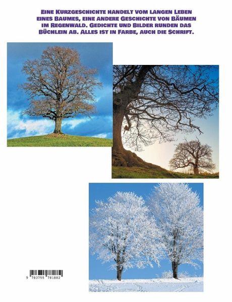 Eine Kurzgeschichte handelt vom langen Leben eines Baumes, eine andere Geschichte von Bäumen im Regenwald. Gedichte und Bilder runden das Büchlein ab. Alles ist in Farbe, auch die Schrift.