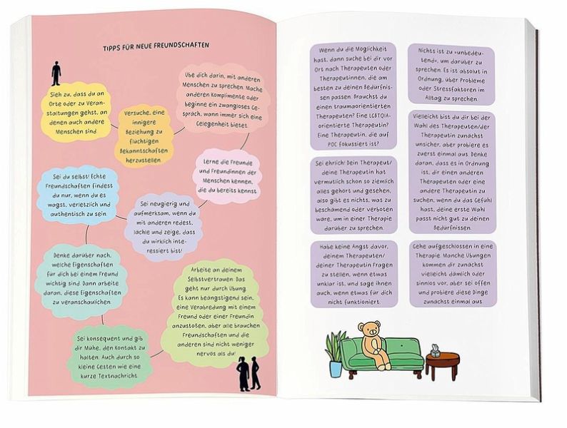 Mithilfe von über 50 Illustrationen, persönlichen Geschichten der Autorin und konkreten, alltagstauglichen Impulsen und Anregungen lernen wir den Umgang mit