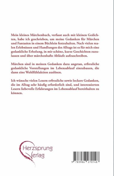 Mein kleines Märchenbuch, verfasst auch mit kleinen Gedichten, habe ich geschrieben, um meine Gedanken für Märchen und Fantasien in einem Büchlein festzuhalten. Nach vielen realen Erlebnissen und Handlungen des Alltags ist es für mich eine gedankliche Erholung, in mir schöne, kurze Geschichten zuzulassen und über märchenhafte Abläufe aufzuschreiben. Märchen sind in meinen Gedanken dazu angetan, erfreuliche gedankliche Vorstellungen im Lebensablauf einzubauen, die dann eine Wohlfühlaktion auslösen. Ich wünsche vielen Lesern erfreuliche sowie lockere Gedanken, die im Alltag sehr häufig erforderlich sind, und interessierten Lesern liebevolle Erfahrungen im Lebensablauf bereithalten zu können.