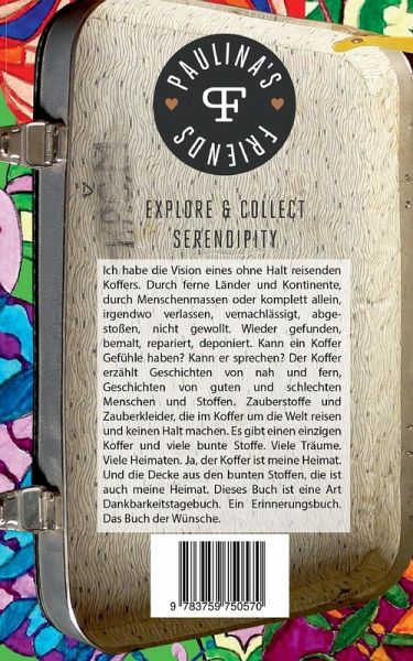 Ich habe die Vision eines ohne Halt reisenden Koffers. Durch ferne Länder und Kontinente, durch Menschenmassen oder komplett allein, irgendwo verlassen, vernachlässigt, abgestoßen, nicht gewollt. Wieder gefunden, bemalt, repariert, deponiert. Kann ein Koffer Gefühle haben? Kann er sprechen? Der Koffer erzählt Geschichten von nah und fern, Geschichten von guten und schlechten Menschen und Stoffen. Zauberstoffe und Zauberkleider, die im Koffer um die Welt reisen und keinen Halt machen. Es gibt einen einzigen Koffer und viele bunte Stoffe. Viele Träume. Viele Heimaten. Ja, der Koffer ist meine Heimat. Und die Decke aus den bunten Stoffen, die ist auch meine Heimat. Dieses Buch ist eine Art Dankbarkeitstagebuch. Ein Erinnerungsbuch. Das Buch der Wünsche.