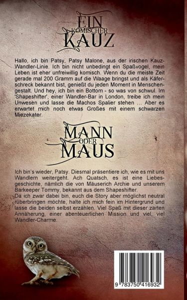 Ein komischer KauzHallo, ich bin Patsy, Patsy Malone, aus der irischen Kauz-Wandler-Linie.Ich bin nicht unbedingt ein Spaßvogel, mein Leben ist eher unfreiwillig komisch. Wenn du die meiste Zeit gerade mal 200 Gramm auf die Waage bringst und als Käferschreck bekannt bist, genießt du jeden Moment in Menschengestalt.Und hey, ich bin ein Bottom - so was von schwul. Im "Shapeshifter", einer Wandler-Bar in London, treibe ich mein Unwesen und lasse die Machos Spalier stehen. Aber es erwartet mich noch etwas Großes mit einem schwarzen Miezekater.Mann oder MausIch bin's wieder, Patsy. Diesmal präsentiere ich, wie es mit uns Wandlern weitergeht. Ach Quatsch, es ist eine Liebesgeschichte, nämlich die von Mäuserich Archie und unserem Barkeeper Tommy, bekannt aus dem "Shapeshifter".Da ich zwar dabei bin, euch die Story aber möglichst neutral rüberbringen möchte, halte ich mich fein im Hintergrund und lasse die beiden selbst erzählen. Viel Spaß mit dieser zarten Annäherung, einer abenteuerlichen Mission und viel, viel Wandler-Charme.Dein komischer Kauz