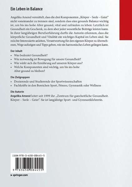 Angelika Amend vermittelt, dass die drei Komponenten Körper Seele Geist nicht von einander zu trennen sind, sondern dass eine gesunde Balance wichtig ist, um bis ins hohe Alter gesund, vital und zufrieden zu leben: Letztlich ist Gesundheit ein Geschenk, zu dem aber jeder wesentliche Beiträge leisten kann. In ihrer langjährigen Berufserfahrung durfte die Autorin erkennen, dass die körperliche Gesundheit und Vitalität ein wichtiges Kapital im Leben sind. Sie möchte Interessierte anleiten, Verantwortung für den eigenen Körper zu übernehmen, Wege aufzeigen und Tipps geben, wie ein harmonisches Leben gelingen kann.