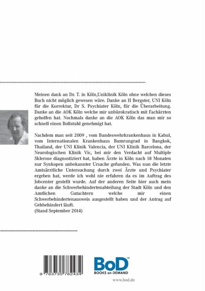 Mit jedem Tag stellte ich fest, dass mich schrittweise meine Kraft verließ. Eine Taubheit und Empfindungstörungen traten an Steißbein und Damm auf. Schließlich hatte mich die Kraft der Beine um den 4. Dezember herum fast ganz verlassen. Ich verblieb in diesem außergewöhnlichen Zustande der Schwäche für etwa 21 Tage ..." Meinen Hochachtung an Dr. Dr. T und B ,in Köln Rath Heumar sowie an die Fachärztin für Innere Medizin , Köln Mehrheim und and die Uniklinik Köln ohne welchen dieses Buch nicht möglich gewesen wäre. Einen besonderen Dank an Horst Bergster, Student der Medizin Köln für die Lektüre und Korrektur sowie an Dr S. Psychiater und Neurologe in Köln Müllheim für die Fachliche Überarbeitung. Meinen dank an die AOK Köln welche mir unbürokratisch mit Fachärzten geholfen hat, nachdem ich in Köln nach 13 Monaten als AOK Versicherter keinen Termin bei Fachärzten bekommen habe. Auch nochmals danke an die AOK Köln das man mir so schnell einen Rollstuhl genehmigt hat und nachdem ichmeinen linken Arm und linken Fuß manchmal nicht hochbringe mich mit einen Elektrischen versorgte. Ein besonderer Vermerk geht hier an die Diagnosen der Ärzte in Köln: Nachdem man seit 2009 , vom Bundeswehrkrankenhaus in Kabul, vom Internationalen Krankenhaus Bumrungrad in Bangkok , Thailand, von der UNI Klinik Valencia , von der UNI Klinik Barcelona , von der Neurologischen Klinik in Vic, Uni bei mir den Verdacht auf Multiple Sklerose diagnostiziert hat, haben Ärzte in Deutschland, Köln nach 18 Monaten nur eine Diagnostik gefunden: Synkopen unbekannter Ursache. Aus welchen Grund auch immer. Was nun die letzte Amtsärztliche Untersuchung durch zwei Ärzte und einen Psychiater ergeben hat, werde ich wohl nie erfahren da es im Auftrag des Jobcenter gestellt wurde. Auf der anderen Seite hier auch mein dank an die Schwerbehindertenabteilung der Stadt Köln und den Amtlichen Gutachtern welche mir wenigstens einen Schwerbehindertenausweis ausgestellt haben und der Antrag auf Gehbehindert läuft. (Stand September 2014)