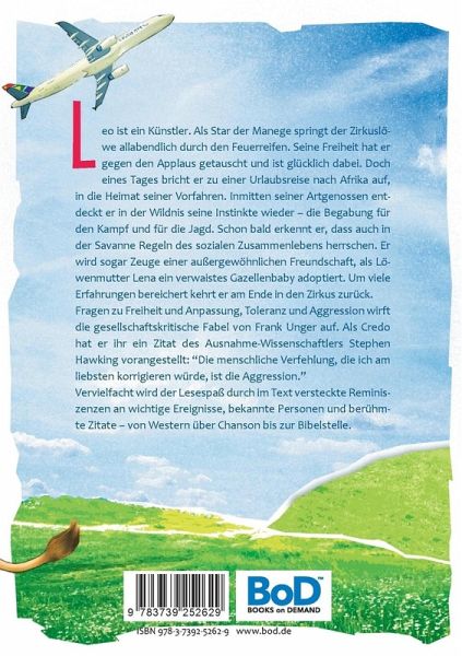 Leo ist ein Künstler. Als Star der Manege springt der Zirkuslöwe allabendlich durch den Feuerreifen. Seine Freiheit hat er gegen den Applaus getauscht und ist glücklich dabei. Doch eines Tages bricht er zu einer Urlaubsreise nach Afrika auf, in die Heimat seiner Vorfahren. Inmitten seiner Artgenossen entdeckt er in der Wildnis seine Instinkte wieder - die Begabung für den Kampf und für die Jagd. Schon bald erkennt er, dass auch in der Savanne Regeln des sozialen Zusammenlebens herrschen. Er wird sogar Zeuge einer außergewöhnlichen Freundschaft, als Löwenmutter Lena ein verwaistes Gazellenbaby adoptiert. Um viele Erfahrungen bereichert kehrt er am Ende in den Zirkus zurück. Fragen zu Freiheit und Anpassung, Toleranz und Aggression wirft die gesellschaftskritische Fabel von Frank Unger auf. Als Credo hat er ihr ein Zitat des Ausnahme-Wissenschaftlers Stephen Hawking vorangestellt: "Die menschliche Verfehlung, die ich am liebsten korrigieren würde, ist die Aggression." Vervielfacht wird der Lesespaß durch im Text versteckte Reminiszenzen an wichtige Ereignisse, bekannte Personen und berühmte Zitate - von Western über Chanson bis zur Bibelstelle.