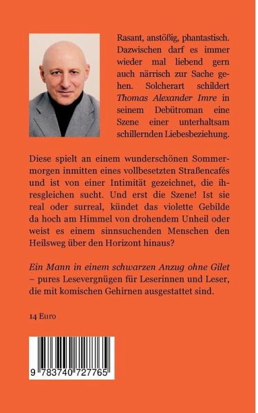 Rasant, phantastisch, anstößig. Dazwischen soll und darf es immer wieder mal liebend gern auch närrisch zur Sache gehen. Solcherart schildert Thomas Alexander Imre in seinem Debütroman eine Szene einer schillernden Liebesbeziehung. Diese spielt an einem wunderschönen Sommermorgen inmitten eines vollbesetzten Cafés und ist von einer Intimität gezeichnet, die ihresgleichen sucht. Und erst die Szene! Ist sie real oder surreal, kündet das violette Gebilde da hoch am Himmel von drohendem Unheil oder weist es einem sinnsuchenden Menschen den Heilsweg über den Horizont hinaus? Ein Mann in einem schwarzen Anzug ohne Gilet - pures Lesevergnügen für Leserinnen und Leser, die mit komischen Gehirnen ausgestattet sind.