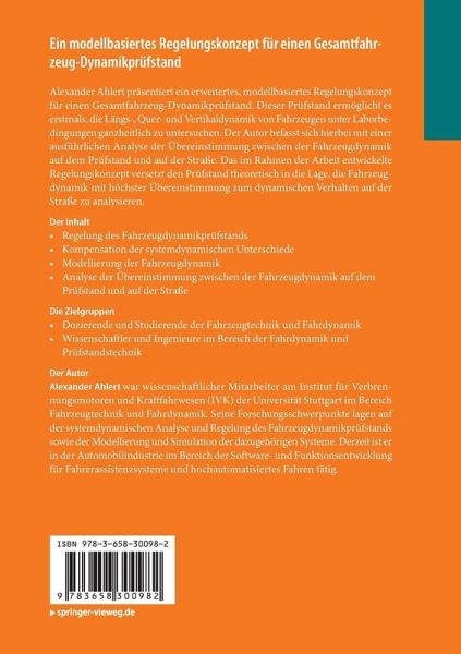 Alexander Ahlert war wissenschaftlicher Mitarbeiter am Institut für Verbrennungsmotoren und Kraftfahrwesen (IVK) der Universität Stuttgart im Bereich Fahrzeugtechnik und Fahrdynamik. Seine Forschungsschwerpunkte lagen auf der systemdynamischen Analyse und Regelung des Fahrzeugdynamikprüfstands sowie der Modellierung und Simulation der dazugehörigen Systeme. Derzeit ist er in der Automobilindustrie im Bereich der Software- und Funktionsentwicklung für Fahrerassistenzsysteme und hochautomatisiertes Fahren tätig.