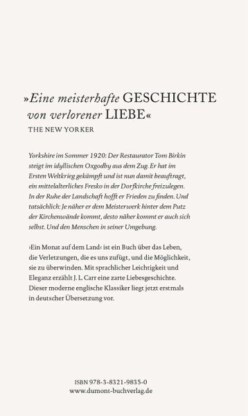 Sommer 1920 im nordenglischen Oxgodby: Als auf dem Bahnhof ein Londoner aus dem Zug steigt, weiß gleich das ganze Dorf Bescheid: Er ist der Restaurator, der das mittelalterliche Wandgemälde in der örtlichen Kirche freilegen soll. Doch was steckt hinter der Fassade des stotternden und unter chronischen Gesichtszuckungen leidenden Mannes? Tom Birkin hat im Ersten Weltkrieg gekämpft, als traumatisierter Veteran wurde er von seiner Frau verlassen. Er hofft, in der Ruhe und Einfachheit Yorkshires zu gesunden. Und tatsächlich: Je näher er dem Meisterwerk hinter der Kirchendecke kommt, desto näher kommt er auch sich selbst. Und seinen Mitmenschen. Langsam gelingt es ihm, sich der Welt um sich herum zu öffnen, vielleicht sogar der Liebe. Der Monat auf dem Land ist ein Monat der Heilung. Was Birkin hier erlebt, wird er sein Leben lang mit sich tragen...J. L. Carr erzählt von einem Mann, der überlebt, und von der Rettung, die in uns wie den anderen liegt. Dieser moderne Klassiker der englischen Literatur ist in seiner sprachlichen Leichtigkeit und Eleganz eine echte Wiederentdeckung.