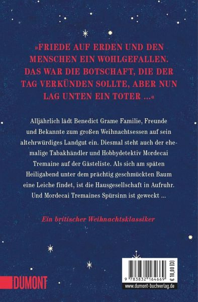 Alljährlich lädt Benedict Grame Familie, Freunde und Bekannte zum Weihnachtsessen auf sein kleines britisches Landgut ein. Im Kreise seiner Lieben inszeniert er ein großes Festtagsspektakel. Dieses Jahr steht auch Mordecai Tremaine auf der Gästeliste. Der ehemalige Tabakhändler mit einer Schwäche für Liebesromane hat sich auch als Hobbydetektiv einen Namen gemacht - und ist vom Privatsekretär des Gastgebers beauftragt worden, die Geladenen im Auge zu behalten. Und tatsächlich: Jedes Mitglied dieser illustren Gesellschaft scheint etwas zu verbergen. Mordecai tastet sich durch ein Netz aus Lügen, Untreue, Erpressung und Verrat. Spätestens als um Mitternacht zwischen den Geschenken unter dem Baum eine Leiche liegt, ist ihm klar: Diese Weihnacht wird alles andere als besinnlich.