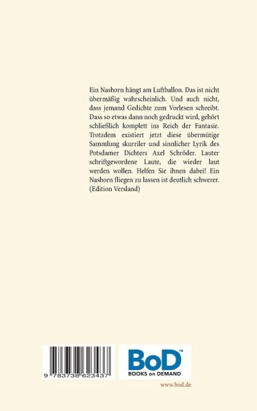 Ein Nashorn hängt am Luftballon - Lauter laute Laute. Gedichte zum Weitererzählen. Lyrik, die laut gelesen sein will. Eine Sammlung mit Gedichten von Axel Schröder. Ausgesprochen schöne und skurrile Texte mit Anklängen an Morgenstern, Rilke Tucholsky und Kästner. Ein Vorlesevergnügen in Reimen, die versuchen, sich auf das Leben einen Reim zu machen.