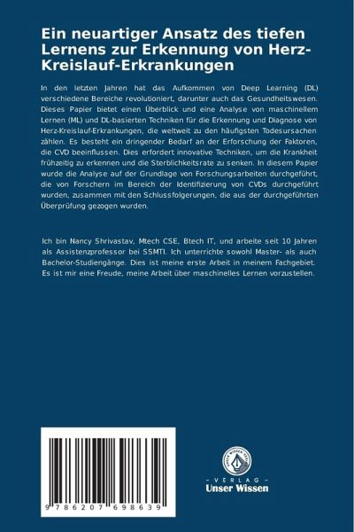 In den letzten Jahren hat das Aufkommen von Deep Learning (DL) verschiedene Bereiche revolutioniert, darunter auch das Gesundheitswesen. Dieses Papier bietet einen Überblick und eine Analyse von maschinellem Lernen (ML) und DL-basierten Techniken für die Erkennung und Diagnose von Herz-Kreislauf-Erkrankungen, die weltweit zu den häufigsten Todesursachen zählen. Es besteht ein dringender Bedarf an der Erforschung der Faktoren, die CVD beeinflussen. Dies erfordert innovative Techniken, um die Krankheit frühzeitig zu erkennen und die Sterblichkeitsrate zu senken. In diesem Papier wurde die Analyse auf der Grundlage von Forschungsarbeiten durchgeführt, die von Forschern im Bereich der Identifizierung von CVDs durchgeführt wurden, zusammen mit den Schlussfolgerungen, die aus der durchgeführten Überprüfung gezogen wurden.