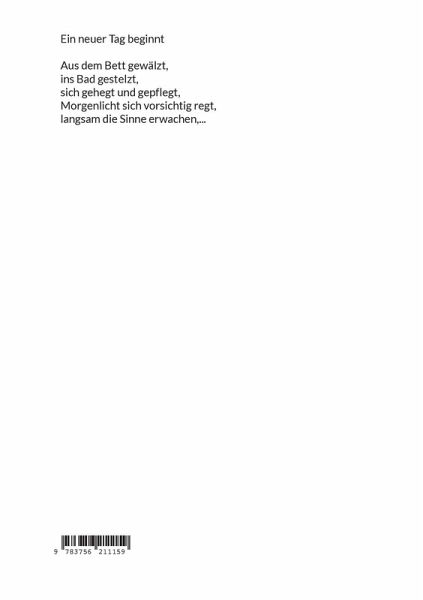 Ein neuer Tag beginntAus dem Bett gewälzt,ins Bad gestelzt,sich gehegt und gepflegt,Morgenlicht sich vorsichtig regt,langsam die Sinne erwachen,...