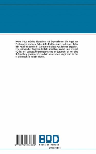 Mit diesem Buch möchte der Autor Depressionspatienten die Angst vor Psychologen und dem Reha-Aufenthalt nehmen, indem er sie Schritt für Schritt durch diese Maßnahmen begleitet. Egal, mit welcher Diagnose ein Patient entlassen wird, er erkennt, dass der bewusst eingesetzte Glaube an Gott mehr als nur eine Hilfestellung gewährleistet - und ein neues Leben möglich ist, für das es sich erstmals zu leben lohnt.
