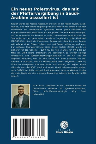 Kürzlich wurde bei Paprika (Capsicum annuum) in der Region Riyadh, Saudi-Arabien, eine interveinale Vergilbung und ein Aufrollen des Blattes nach oben beobachtet. Die beobachteten Symptome wiesen große Ähnlichkeit mit Paprika-infizierenden Poleroviren auf. Ein generischer RT-PCR-Test bestätigte das Vorhandensein des Polerovirus in den untersuchten Paprikaproben. Die Sequenzierung des generischen Amplikons ergab eine hohe Ähnlichkeit (87,6-98,1% in nt) mit vier Poleroviren: Tobacco vein distorting virus, Pepper vein yellows virus, Pepper yellows virus und Pepper yellow leaf curl virus. Zur weiteren Charakterisierung eines dieser Isolate (105-D) wurde ein größerer Teil des Genoms (~1300 nt), der vom 3'-Ende von ORF2 bis zur Mitte von ORF3 reicht, amplifiziert und sequenziert. Es wurden niedrige Aminosäure- und Nukleotid-Identitätsprozentsätze in den CP- und MP-Teilgenen berechnet, was zur NGS führte, um einen größeren Teil des Genoms zu erfassen, was zur Rekonstruktion eines Teilgenoms (5496 nt) führte; ein divergentes Polerovirus-Isolat, das vorläufig als "Pepper leafroll chlorosis virus (PeLRCV)" bezeichnet wurde. Gewächshausversuche zeigten, dass PeLRCV von Aphis gossypii übertragen wird. Unseres Wissens ist dies die erste Studie, die sich mit einem Polerovirus befasst, das Paprika in KSA infiziert.
