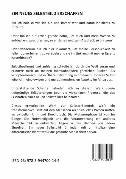 EIN NEUES SELBSTBILD ERSCHAFFEN Bin ich halt so wie ich bin und immer war und daran ist nichts zu rütteln? Oder bin ich auf Erden gerade dafür, um mich und mein Wesen zu entdecken, zu erforschen, zu entfalten und zum Ausdruck zu bringen? Oder wiederum bin ich hier inkarniert, um meine Persönlichkeit zu feilen, zu verfeinern, zu veredeln und sie im Einklang mit meiner Essenz zu verbinden? Selbstbestimmt und aufrichtig schreite ich durch die Welt voran und erinnere mich an meinen innewohnenden göttlichen Funken. Als Schöpfermensch und in Übereinstimmung mit meinem Höheren Selbst lebe ich meine ewigen und multidimensionalen Aspekte im Alltag aus. Unterstützende Schritte befinden sich in diesem Werk sowie tiefgründige Erläuterungen über die vielseitigen Prozesse, die das Erschaffen eines neuen Selbstbildes beinhalten. Dieses unterstützende Werk zur Selbsterkenntnis wirft ein transformatives Licht auf den Menschen als spirituelles Wesen mitten im aktuellen Um- und Durchbruch. Die Metamorphose ist voll im Gange. Die Notwendigkeit und die Verantwortung ein anderes Menschenbild zu entwerfen, liegen in den Händen von jedem Einzelnen. Ein neues Selbstbild für jeden ruft unmittelbar eine differenzierte Identität für die gesamte Menschheit hervor.