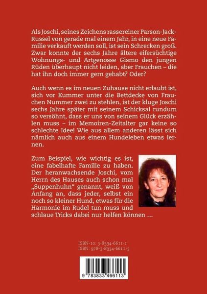 Als Joschi, seines Zeichens rassereiner Parson-Jack-Russel von gerade mal einem Jahr, in eine neue Familie verkauft werden soll, ist sein Schrecken groß. Zwar konnte der sechs Jahre ältere eifersüchtige Wohnungs- und Artgenosse Gismo den jungen Rüden überhaupt nicht leiden, aber Frauchen - die hat ihn doch immer gern gehabt? Oder?Auch wenn es im neuen Zuhause nicht erlaubt ist, sich vor Kummer unter die Bettdecke von Frauchen Nummer zwei zu stehlen, ist der kluge Joschi sechs Jahre später mit seinem Schicksal rundum so versöhnt, dass er uns von seinem Glück erzählen muss - im Memoiren-Zeitalter gar keine so schlechte Idee! Wie aus allem anderen lässt sich nämlich auch aus einem Hundeleben etwas lernen.Zum Beispiel, wie wichtig es ist, eine fabelhafte Familie zu haben. Der heranwachsende Joschi, vom Herrn des Hauses auch schon mal "Suppenhuhn" genannt, weiß von Anfang an, dass jeder, selbst ein noch so kleiner Hund, etwas für die Harmonie im Rudel tun muss und schlaue Tricks dabeinur helfen können ...
