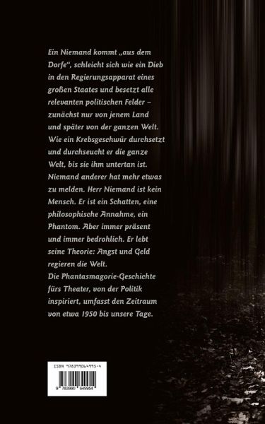 Ein Niemand kommt "aus dem Dorfe", schleicht sich wie ein Dieb in den Regierungsapparat eines großen Staates und besetzt alle relevanten politischen Felder - zunächst nur von jenem Land und später von der ganzen Welt. Wie ein Krebsgeschwür durchsetzt und durchseucht er die ganze Welt, bis sie ihm untertan ist. Niemand anderer hat mehr etwas zu melden. Herr Niemand ist kein Mensch. Er ist ein Schatten, eine philosophische Annahme, ein Phantom. Aber immer präsent und immer bedrohlich. Er lebt seine Theorie: Angst und Geld regieren die Welt.Die Phantasmagorie-Geschichte fürs Theater, von der Politik inspiriert, umfasst den Zeitraum von etwa 1950 bis unsere Tage.