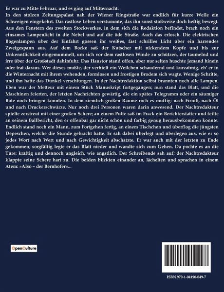 Es war zu Mitte Februar, und es ging auf Mitternacht. In den stolzen Zeitungspalast nah der Wiener Ringstraße war endlich für kurze Weile ein Schweigen eingekehrt. Das rastlose Leben verstummte, das ihn sonst stoßweise doch heftig bewegt. Aus den Fenstern des zweiten Stockwerkes, in dem sich die Redaktion befindet, brach noch ein einsames Lampenlicht in die Nebel und auf die öde Straße. Auch das erlosch. Die elektrischen Bogenlampen über der Einfahrt gossen ihr weißes, fast schrilles Licht über ein harrendes Zweigespann aus. Auf dem Bocke saß der Kutscher mit nickendem Kopfe und bis zur Unkenntlichkeit eingemummelt, um sich vor dem rastlosen Winde zu schützen, der taumelnd und irre über der Großstadt dahinfuhr. Das Haustor stand offen, aber nur selten huschte jemand hinein oder trat daraus. Wer dieses mußte, der verhielt ein Weilchen schaudernd und kurzatmig, eh' er in die Winternacht mit ihrem wehenden, formlosen und frostigen Brodem sich wagte. Wenige Schritte, und ihn hatte das Dunkel verschlungen. In der Nachtredaktion selbst brannten noch alle Lampen. Eben war der Metteur mit einem Stück Manuskript fortgegangen; nun stand das Blatt, und die Maschinen feierten, der letzten Nachrichten gewärtig, die ein spätes Telegramm oder ein säumiger Bote noch bringen konnten. In dem ziemlich großen Raume roch es muffig: nach Firniß, nach Öl und nach Druckerschwärze. Nur noch drei Personen waren darin anwesend. Der Nachtredakteur spielte zerstreut mit einer großen Schere; an einem Pulte saß im Frack ein Berichterstatter und feilte an seinem Ballbericht, den er offenbar gar nicht schön und farbig genug herausbekommen konnte. Endlich stand noch ein Mann, zum Fortgehen fertig, an einem Tischchen und überflog die jüngsten Depeschen, welche die Stunde gebracht hatte. Er sah dabei überlegt und überlegen aus, wie er so jedes Wort nach Wert und nach Gewichtigkeit abschätzte. Er war auch mit der letzten zu Ende gekommen; sorgfältig legte er das Blatt nieder und wandte sich zum Gehen. Da pochte es an die Türe: kräftig und dennoch ungleich, wie ängstlich. Der Schreibende sah auf; der Nachtredakteur klappte seine Schere hart zu. Die beiden blickten einander an, lächelten und sprachen in einem Atem: »Also ¿ der Bernhofer«...