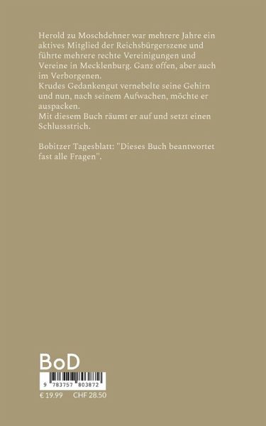 Herold zu Moschdehner war mehrere Jahre ein aktives Mitglied der Reichsbürgerszene und führte mehrere rechte Vereinigungen und Vereine in Mecklenburg. Ganz offen, aber auch im Verborgenen. Krudes Gedankengut vernebelte seine Gehirn und nun, nach seinem Aufwachen, möchte er auspacken. Mit diesem Buch räumt er auf und setzt einen Schlussstrich. Bobitzer Tagesblatt: "Dieses Buch beantwortet fast alle Fragen".
