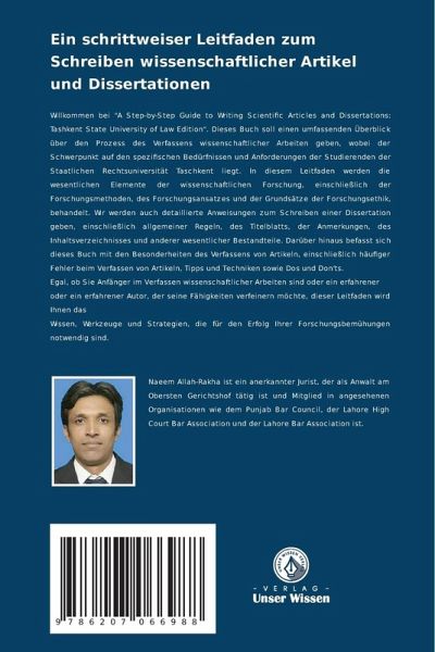 Willkommen bei "A Step-by-Step Guide to Writing Scientific Articles and Dissertations: Tashkent State University of Law Edition". Dieses Buch soll einen umfassenden Überblick über den Prozess des Verfassens wissenschaftlicher Arbeiten geben, wobei der Schwerpunkt auf den spezifischen Bedürfnissen und Anforderungen der Studierenden der Staatlichen Rechtsuniversität Taschkent liegt. In diesem Leitfaden werden die wesentlichen Elemente der wissenschaftlichen Forschung, einschließlich der Forschungsmethoden, des Forschungsansatzes und der Grundsätze der Forschungsethik, behandelt. Wir werden auch detaillierte Anweisungen zum Schreiben einer Dissertation geben, einschließlich allgemeiner Regeln, des Titelblatts, der Anmerkungen, des Inhaltsverzeichnisses und anderer wesentlicher Bestandteile. Darüber hinaus befasst sich dieses Buch mit den Besonderheiten des Verfassens von Artikeln, einschließlich häufiger Fehler beim Verfassen von Artikeln, Tipps und Techniken sowie Dos und Don'ts. Egal, ob Sie Anfänger im Verfassen wissenschaftlicher Arbeiten sind oder ein erfahreneroder ein erfahrener Autor, der seine Fähigkeiten verfeinern möchte, dieser Leitfaden wird Ihnen dasWissen, Werkzeuge und Strategien, die für den Erfolg Ihrer Forschungsbemühungen notwendig sind.