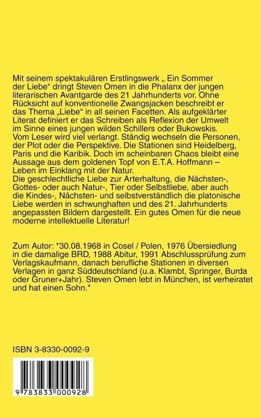 Mit seinem Erstlingswerk "Ein Sommer der Liebe" dringt Steven Omen in die Phalanx der jungen literarischen Avantgarde des 21. Jahrhunderts vor. Darin beschreibt er das Thema "Liebe" in all seinen Facetten. Als aufgeklärter Literat definiert er das Schreiben als Reflexion der Umwelt im Sinne eines jungen wilden Schillers oder Bukowskis. Die Stationen sind Heidelberg, Paris, New York und die Karibik. Doch im scheinbaren Chaos bleibt eine Aussage aus dem goldenen Topf von E.T.A. Hoffmann - Leben im Einklang mit der Natur. Ein gutes Omen für die neue moderne Intellektuelle Literatur!