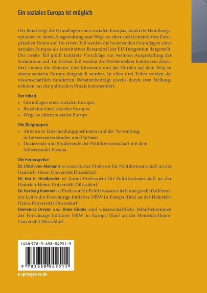 Der Band zeigt die Grundlagen eines sozialen Europas, konkrete Handlungsoptionen zu deren Ausgestaltung und Wege zu einer sozial orientierten Europäischen Union auf. Im ersten Teil werden die bestehenden Grundlagen eines sozialen Europas als konstitutiver Bestandteil der EU-Integration dargestellt. Der zweite Teil greift konkrete Vorschläge zur weiteren Ausgestaltung der Sozialunion auf. Im letzten Teil werden die Problemfelder kontrovers diskutiert, indem die Akteure, ihre Interessen und die Hürden auf dem Weg zu einem sozialen Europa dargestellt werden. In allen drei Teilen werden die wissenschaftlich fundierten Debattenbeiträge jeweils durch zwei Stellungnahmen aus der politischen Praxis kommentiert.
