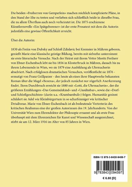 Die beiden "Freiherren von Gemperlein" machen reichlich komplizierte Pläne, in den Stand der Ehe zu treten und verlieben sich schließlich beide in dieselbe Frau, die zu allem Überfluss auch noch verheiratet ist. Die 1875 erschienene Künstlernovelle "Ein Spätgeborener" ist der erste Prosatext mit dem die Autorin jedenfalls eine gewisse Öffentlichkeit erreicht.
