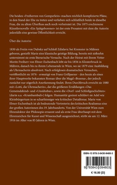 Die beiden "Freiherren von Gemperlein" machen reichlich komplizierte Pläne, in den Stand der Ehe zu treten und verlieben sich schließlich beide in dieselbe Frau, die zu allem Überfluss auch noch verheiratet ist. Die 1875 erschienene Künstlernovelle "Ein Spätgeborener" ist der erste Prosatext mit dem die Autorin jedenfalls eine gewisse Öffentlichkeit erreicht.