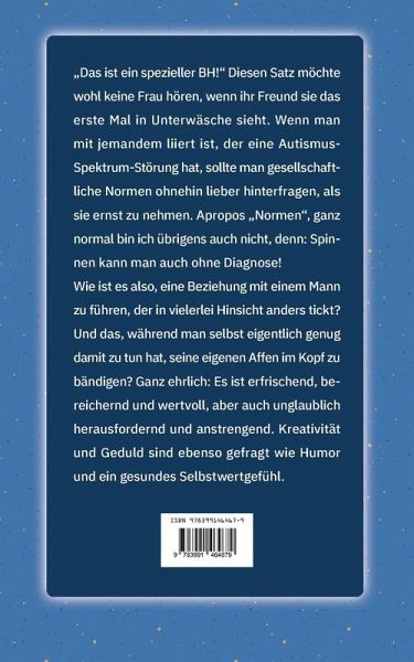 "Das ist ein spezieller BH!" Diesen Satz möchte wohl keine Frau hören, wenn ihr Freund sie das erste Mal in Unterwäsche sieht. Wenn man mit jemandem liiert ist, der eine Autismus-Spektrum-Störung hat, sollte man gesellschaftliche Normen ohnehin lieber hinterfragen, als sie ernst zu nehmen. Apropos "Normen", ganz normal bin ich übrigens auch nicht, denn: Spinnen kann man auch ohne Diagnose!Wie ist es also, eine Beziehung mit einem Mann zu führen, der in vielerlei Hinsicht anders tickt? Und das, während man selbst eigentlich genug damit zu tun hat, seine eigenen Affen im Kopf zu bändigen? Ganz ehrlich: Es ist erfrischend, bereichernd und wertvoll, aber auch unglaublich herausfordernd und anstrengend. Kreativität und Geduld sind ebenso gefragt wie Humor und ein gesundes Selbstwertgefühl.