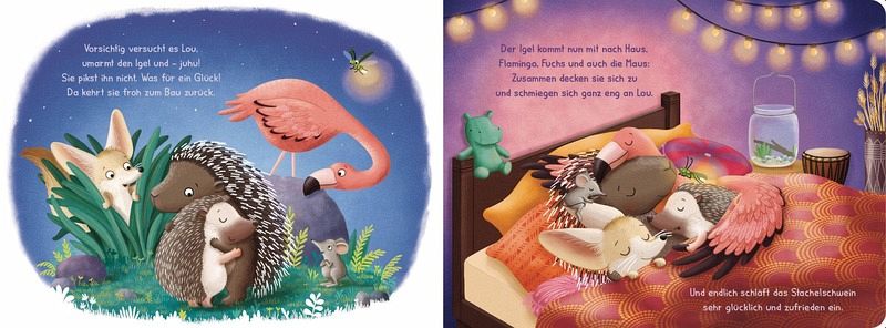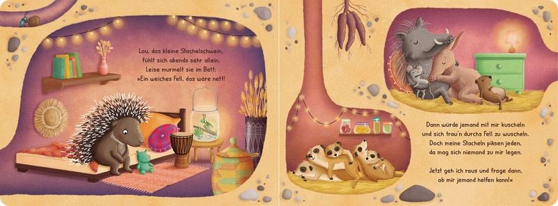 Dieses Buch besteht aus stabiler Hartpappe und ist damit bestens geeignet für Kleinkinder. Hier wird eine herzerwärmende Geschichte erzählt, die sich gut als abendliche Vorleselektüre eignet. Die Bilder sind allerliebst anzusehen, die Tierarten und die jeweiligen Emotionen kann man gut erkennen und sich in das traurige Stacheltier hinein fühlen. Die wunderschön gereimten Texte verdeutlichen die Vorgänge in der Geschichte und verleiten zum Mitreimen. Das kommt immer gut an!