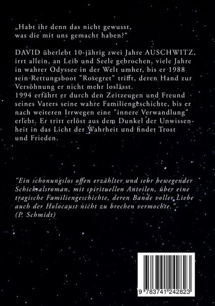 "Habt ihr denn das nicht gewusst, was die mit uns gemacht haben?" DAVID überlebt 10-jährig zwei Jahre AUSCHWITZ, irrt allein, an Leib und Seele gebrochen, viele Jahre in wahrer Odyssee in der Welt umher, bis er 1988 sein Rettungsboot "Rosegret" trifft, deren Hand zur Versöhnung er nicht mehr loslässt. 1994 erfährt er durch den Zeitzeugen und Freund seines Vaters seine wahre Familiengeschichte, bis er nach weiteren Irrwegen eine "innere Verwandlung" erlebt. Er tritt erlöst aus dem Dunkel der Unwissenheit in das Licht der Wahrheit und findet Trost und Frieden."Ein schonungslos offen erzählter und sehr bewegender Schicksalsroman, mit spirituellen Anteilen, über eine tragische Familiengeschichte, deren Bande voller Liebe auch der Holocaust nicht zu brechen vermochte." (P. Schmidt)