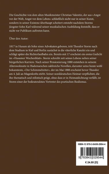 Die Geschichte von dem alten Musikmeister Christian Valentin, der aus "Angst vor der Welt, Angst vor dem Leben" schließlich nicht nur in seiner Kunst, sondern in seiner Existenz überhaupt scheitert entsteht nachdem Storms jüngster Sohn Karl während seiner musikalischen Ausbildung feststellt, dass er nicht vor Publikum auftreten kann.