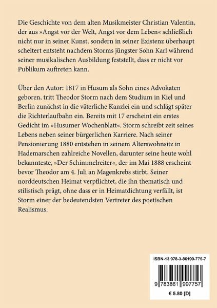 Die Geschichte von dem alten Musikmeister Christian Valentin, der aus "Angst vor der Welt, Angst vor dem Leben" schließlich nicht nur in seiner Kunst, sondern in seiner Existenz überhaupt scheitert entsteht nachdem Storms jüngster Sohn Karl während seiner musikalischen Ausbildung feststellt, dass er nicht vor Publikum auftreten kann.