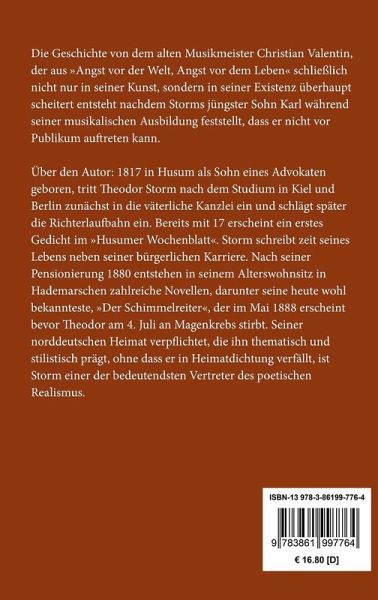Die Geschichte von dem alten Musikmeister Christian Valentin, der aus "Angst vor der Welt, Angst vor dem Leben" schließlich nicht nur in seiner Kunst, sondern in seiner Existenz überhaupt scheitert entsteht nachdem Storms jüngster Sohn Karl während seiner musikalischen Ausbildung feststellt, dass er nicht vor Publikum auftreten kann.
