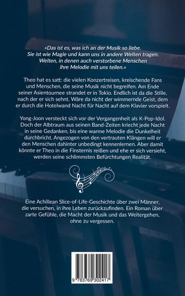 "Das ist es, was ich an der Musik so liebe. Sie ist wie Magie und kann uns in andere Welten tragen. Welten, in denen auch verstorbene Menschen ihre Melodie mit uns teilen." Theo hat es satt: die vielen Konzertreisen, kreischende Fans und Menschen, die seine Musik nicht begreifen. Am Ende seiner Asientournee strandet er in Tokio. Endlich ist da die Stille, nach der er sich sehnt. Wäre da nicht der wimmernde Geist, dem er durch die Hotelwand Nacht für Nacht auf dem Klavier vorspielt. Yong-Joon versteckt sich vor der Vergangenheit als K-Pop-Idol. Doch der Albtraum aus seinen Band-Zeiten kriecht jede Nacht in seine Gedanken, bis eine warme Melodie die Dunkelheit durchbricht. Angezogen von den vertrauten Klängen will er den Menschen dahinter unbedingt kennenlernen. Aber damit könnte er Theo in die Finsternis reißen und ehe er sich versieht, werden seine schlimmsten Befürchtungen Realität. Eine Achillean Slice-of-Life-Geschichte über zwei Männer, die versuchen, in ihre Leben zurückzufinden. Ein Roman über zarte Gefühle, die Macht der Musik und das Weitergehen, ohne zu vergessen.