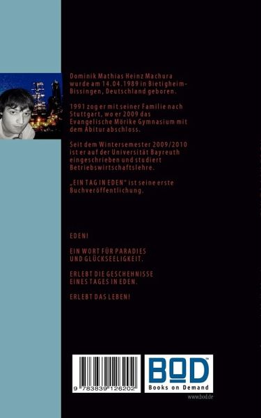 Dominik Mathias Heinz Machurawurde am 14.04.1989 in Bietigheim-Bissingen, Deutschland geboren.1991 zog er mit seiner Familie nach Stuttgart, wo er2009 das Evangelische Mörike Gymnasium mit demAbitur abschloss.Seit dem Wintersemester 2009/2010 ist er auf derUniversität Bayreuth eingeschrieben und studiertBetriebswirtschaftslehre."EIN TAG IN EDEN" ist seine erste Buchveröffentlichung.