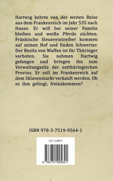 Hartwig kehrte von der weiten Reise aus dem Frankenreich im Jahr 535 nach Hause. Er will bei seiner Familie bleiben und weiße Pferde züchten. Fränkische Steuereintreiber kommen auf seinen Hof und finden Schwerter. Der Besitz von Waffen ist für Thüringer verboten. Sie nehmen Hartwig gefangen und bringen ihn zum Verwaltungssitz der ostthüringischen Provinz. Er soll im Frankenreich auf dem Sklavenmarkt verkauft werden. Ob es ihm gelingt, freizukommen?