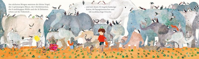 In den wunderbar-wimmeligen Illustrationen lassen sich immer wieder neue Details entdecken, denn wenn 255 Tiere zum Frühstück kommen, wird es ganz schön voll! Zusammen mit den lustigen Essgeräuschen der Tiere wird dieses Bilderbuch zu einem großen Vorlesespaß!
