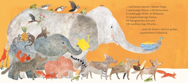 Eines Morgens trifft ein kleiner Junge einen Vogel und gibt ihm Frühstück. Am nächsten Tag kommt der kleine Vogel mit zwei Mäusen zurück, und am nächsten Tag gesellen sich vier Eichhörnchen dazu, dann acht Wölfe und schließlich 16 Elefanten. Der kleine Vogel macht pick, tipp, pick und knusper, knabber, knusper ertönt es von den Eichhörnchen. Bis eines Tages 255 hungrige Tiere für ein gigantisch großes Frühstück erscheinen! Aber wer, fragt sich der Junge, bringt mir eigentlich das Frühstück?!