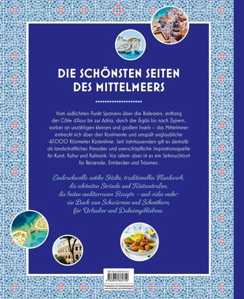 Von der Südspitze Spaniens über die Cote d'Azur und die Adria bis zur Ägäis - das alles ist das Mittelmeer! Dieses hochwertige Geschenkbuch entführt alle Fernwehgeplagten in die faszinierende mediterrane Welt und beleuchtet die Vielfalt dieser Region aus verschiedenen Perspektiven. Entdecke die Köstlichkeiten der mediterranen Küche auf den Märkten von Barcelona und Venedig. Genieße traditionelle Gerichte und einzigartige Rezepte aus allen Ländern des Mittelmeerraums. Besuche antike Stätten in Athen und Rom und erlebe die kulturelle Vielfalt der einzelnen Regionen. Tauche ein in atemberaubende Landschaften, spektakuläre Küstenabschnitte und charmante Hafenstädte. Ein inspirierender Prachtband zum Schmökern und Träumen!