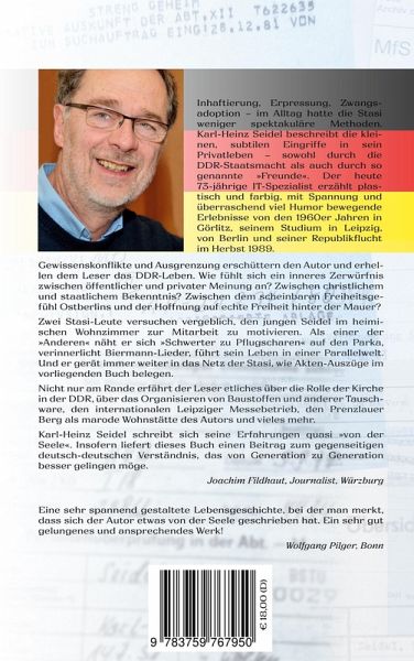 Inhaftierung, Erpressung, Zwangsadoption - im Alltag hatte die Stasi weniger spektakuläre Methoden. Karl-Heinz Seidel beschreibt die kleinen, subtilen Eingriffe in sein Privatleben - sowohl durch die DDR-Staatsmacht als auch durch so genannte »Freunde«. Der heute 73-jährige IT-Spezialist erzählt plastisch und farbig, mit Spannung und überraschend viel Humor bewegende Erlebnisse von den 1960er Jahren in Görlitz, seinem Studium in Leipzig, von Berlin und seiner Republikflucht im Herbst 1989. Gewissenskonflikte und Ausgrenzung erschüttern den Autor und erhellen dem Leser das DDR-Leben. Wie fühlt sich ein inneres Zerwürfnis zwischen öffentlicher und privater Meinung an? Zwischen christlichem und staatlichem Bekenntnis? Zwischen dem scheinbaren Freiheitsgefühl Ostberlins und der Hoffnung auf echte Freiheit hinter der Mauer? Zwei Stasi-Leute versuchen vergeblich, den jungen Seidel im heimischen Wohnzimmer zur Mitarbeit zu motivieren. Als einer der »Anderen« näht er sich »Schwerter zu Pflugscharen« auf den Parka, verinnerlicht Biermann-Lieder, führt sein Leben in einer Parallelwelt. Und er gerät immer weiter in das Netz der Stasi, wie Akten-Auszüge im vorliegenden Buch belegen. Nicht nur am Rande erfährt der Leser etliches über die Rolle der Kirche in der DDR, über das Organisieren von Baustoffen und anderer Tauschware, den internationalen Leipziger Messebetrieb, den Prenzlauer Berg als marode Wohnstätte des Autors und vieles mehr. Karl-Heinz Seidel schreibt sich seine Erfahrungen quasi »von der Seele«. Insofern liefert dieses Buch einen Beitrag zum gegenseitigen deutsch-deutschen Verständnis, das von Generation zu Generation besser gelingen möge.