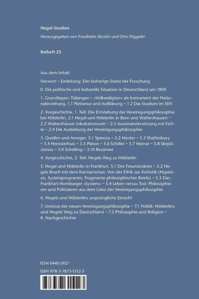 Vorwort ¿ Einleitung: Der bisherige Stand der Forschung ¿ 0. Die politische und kulturelle Situation in Deutschland um 1800 ¿ 1. Grundlagen: Tübingen ¿ »Volksreligion« als Instrument der Nationalerziehung. 1.1 Pietismus und Aufklärung ¿ 1.2 Das Studium im Stift ¿ 2. Vorgeschichte, 1. Teil: Die Entstehung der Vereinigungsphilosophie bei Hölderlin. 2.1 Hegel und Hölderlin in Bern und Waltershausen ¿ 2.2 Waltershäuser Inkubationszeit ¿ 2.3 Auseinandersetzung mit Fichte ¿ 2.4 Die Ausbildung der Vereinigungsphilosophie ¿ 3. Quellen und Anreger. 3.1 Spinoza ¿ 3.2 Herder ¿ 3.3 Shaftesbury ¿ 3.4 Hemsterhuis ¿ 3.5 Platon ¿ 3.6 Schiller ¿ 3.7 Heinse ¿ 3.8 Skeptizismus ¿ 3.9 Schelling ¿ 3.10 Resümee ¿ 4. Vorgeschichte, 2. Teil: Hegels Weg zu Hölderlin ¿ 5. Hegel und Hölderlin in Frankfurt. 5.1 Der Freundeskreis ¿ 5.2 Hegels Bruch mit dem Kantianismus: Von der Ethik zur Ästhetik (Hyperion, Systemprogramm, Fragmente philosophischer Briefe) ¿ 5.3 Das Frankfurt-Homburger »System« ¿ 5.4 Leben versus Tod: Philosophieren und Politisieren aus dem Geist der Vereinigungsphilosophie ¿ 6. Hegels und Hölderlins ursprüngliche Einsicht ¿ 7. Umrisse der neuen Vereinigungsphilosophie ¿ 7.1 Politik: Hölderlins und Hegels Weg zu Deutschland ¿ 7.2 Philosophie und Religion ¿ 8. Nachgeschichte