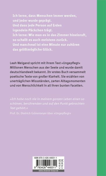 Leah Weigands Video vom Auftritt ihres Poetry-Slam-Textes »Ungepflegt« über ihre Erfahrungen in der Pflege wurde in kürzester Zeit millionenfach geklickt. Die modernen Gedichte der Krankenpflegerin und Medizinstudentin berühren und regen zum Nachdenken an. Mit außergewöhnlicher Wortgewandtheit und Empathie nimmt sie uns mit auf eine Reise durch die Facetten der Menschlichkeit. Eine Reise, die letztendlich zu uns selbst führt und zu dem, was uns als Menschen ausmacht.