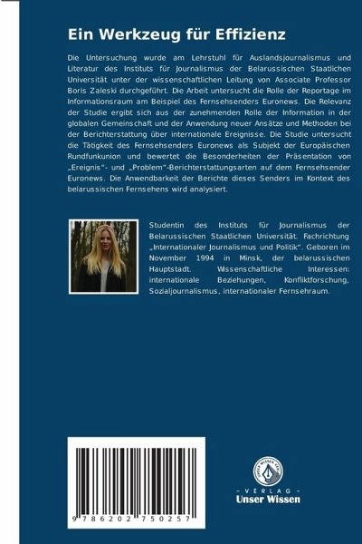 Die Untersuchung wurde am Lehrstuhl für Auslandsjournalismus und Literatur des Instituts für Journalismus der Belarussischen Staatlichen Universität unter der wissenschaftlichen Leitung von Associate Professor Boris Zaleski durchgeführt. Die Arbeit untersucht die Rolle der Reportage im Informationsraum am Beispiel des Fernsehsenders Euronews. Die Relevanz der Studie ergibt sich aus der zunehmenden Rolle der Information in der globalen Gemeinschaft und der Anwendung neuer Ansätze und Methoden bei der Berichterstattung über internationale Ereignisse. Die Studie untersucht die Tätigkeit des Fernsehsenders Euronews als Subjekt der Europäischen Rundfunkunion und bewertet die Besonderheiten der Präsentation von "Ereignis"- und "Problem"-Berichterstattungsarten auf dem Fernsehsender Euronews. Die Anwendbarkeit der Berichte dieses Senders im Kontext des belarussischen Fernsehens wird analysiert.
