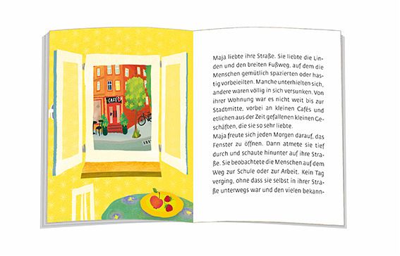 Maja liebt ihre Straße - und die Menschen, die dortvorüberziehen. Und sie hat eine ungewöhnliche Idee, wie sie von Woche zu Woche alle auf der Straße zum Lächeln bringt. Dann kann sie eine Zeit lang nicht zu Hause sein, aber an ihrem Geburtstag kehrt sie zurück - und findet selbst allen Grund zum Lächeln.