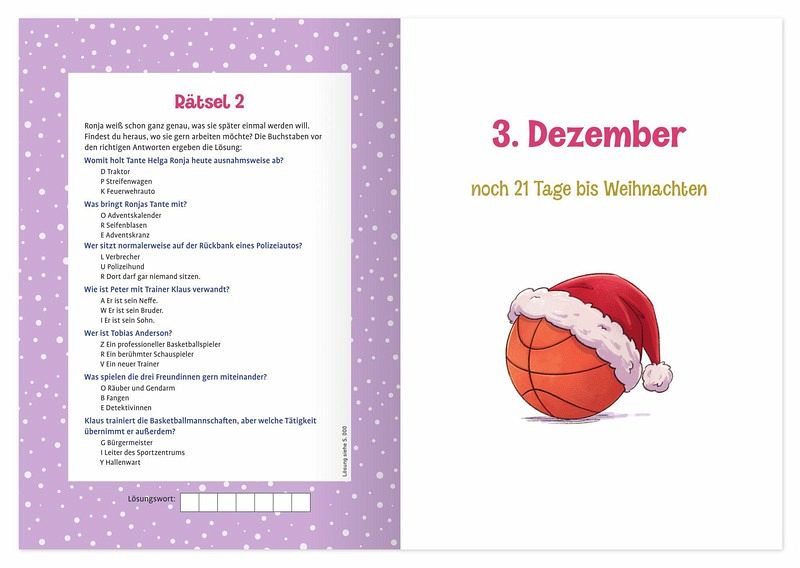 Der spannende Krimiadventskalender begleitet Kinder in 24 Kapiteln durch die Adventszeit. Außerdem wird den kleinen Leserinnen zu jedem Abschnitt ein Weihnachtliches Rätsel gestellt - hier kann jeden Tag im Advent mitgeknobelt werden!