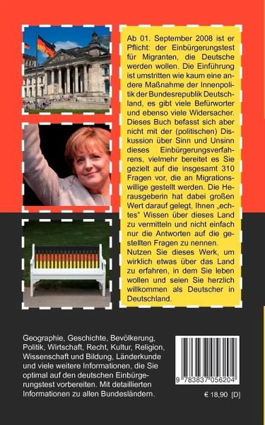 Ab 01. September 2008 ist er Pflicht: der Einbürgerungstest für Migranten, die Deutsche werden wollen. Die Einführung ist umstritten wie kaum eine andere Maßnahme der Innenpolitik der Bundesrepublik Deutschland, es gibt viele Befürworter und ebenso viele Widersacher. Dieses Buch befasst sich aber nicht mit der (politischen) Diskussion über Sinn und Unsinn dieses Einbürgerungsverfahrens, vielmehr bereitet es Sie gezielt auf die insgesamt 310 Fragen vor, die an Migrationswillige gestellt werden. Die Herausgeberin hat dabei großen Wert darauf gelegt, Ihnen "echtes" Wissen über dieses Land zu vermitteln und nicht einfach nur die Antworten auf die gestellten Fragen zu nennen. Nutzen Sie dieses Werk, um wirklich etwas über das Land zu erfahren, in dem Sie leben wollen und seien Sie herzlich willkommen als Deutscher in Deutschland.