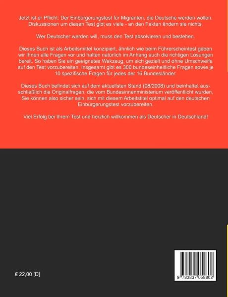 Jetzt ist er Pflicht: Der Einbürgerungstest für Migranten, die Deutsche werden wollen. Diskussionen um diesen Test gibt es viele - an den Fakten ändern sie nichts. Wer Deutscher werden will, muss den Test absolvieren und bestehen. Dieses Buch ist als Arbeitsmittel konzipiert, ähnlich wie beim Führerscheintest geben wir Ihnen alle Fragen vor und halten natürlich im Anhang auch die richtigen Lösungen bereit. So haben Sie ein geeignetes Wekzeug, um sich gezielt und ohne Umschweife auf den Test vorzubereiten. Insgesamt gibt es 300 bundeseinheitliche Fragen sowie je 10 spezifische Fragen für jedes der 16 Bundesländer.Dieses Buch befindet sich auf dem aktuellsten Stand (08/2008) und beinhaltet ausschließlich die Originalfragen, die vom Bundesinnenministerium veröffentlicht wurden, Sie können also sicher sein, sich mit diesem Arbeitstitel optimal auf den deutschen Einbürgerungstest vorzubereiten.Viel Erfolg bei Ihrem Test und herzlich willkommen als Deutscher in Deutschland!