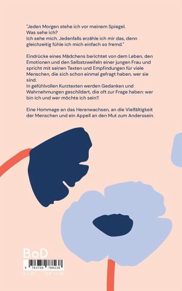 "Jeden Morgen stehe ich vor meinem Spiegel. Was sehe ich? Ich sehe mich. Jedenfalls erzähle ich mir das, denn gleichzeitig fühle ich mich einfach so fremd." Eindrücke eines Mädchens berichtet von dem Leben, den Emotionen und den Selbstzweifeln einer jungen Frau und spricht mit seinen Texten und Empfindungen für viele Menschen, die sich schon einmal gefragt haben, wer sie eigentlich sind. In gefühlvollen Kurztexten werden Gedanken und Wahrnehmungen geschildert, die oft zur Frage haben: wer bin ich und wer möchte ich sein? Die Autorin erzählt Geschichten aus dem Leben und betont dabei die alltäglichen Kämpfe, die viele Menschen austragen. Eine Hommage an das Heranwachsen, an die Vielfältigkeit der Menschen und ein Appell an den Mut zum Anderssein.